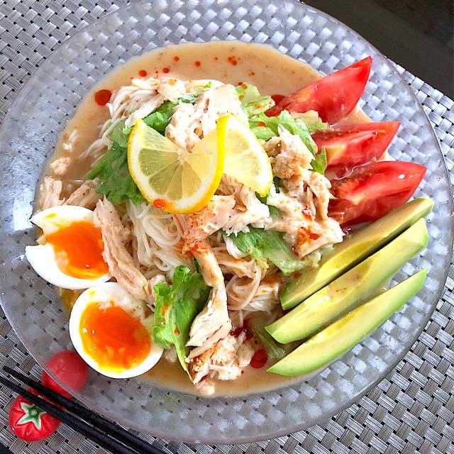 マヨネーズは入れるとコクが増しますが、なしでも構いません。 - 器にそうめんを盛り、ささみ・きゅうり・トマトを彩りよくのせ、上からごまだれをたっぷりかけて完成です♪
